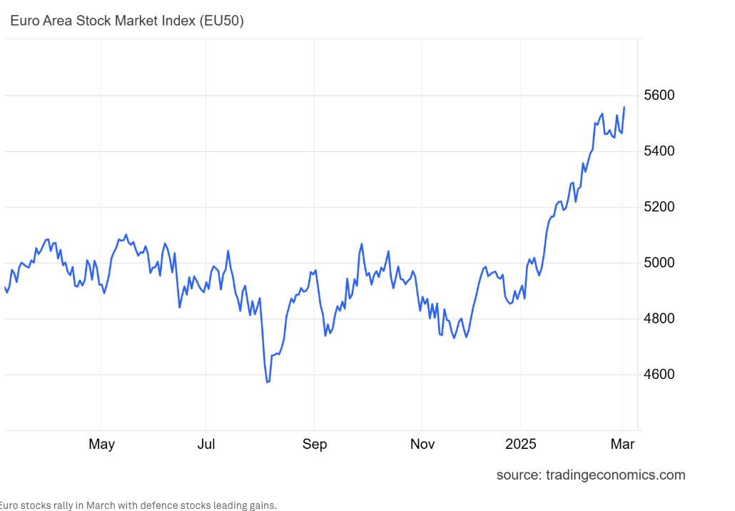 This proposal, which would see Europe match and potentially surpass America's defense spending, cheered the euro and boosted both German and European defense and security stocks this week reflecting optimism for stronger growth which was further supported by the European Central Bank's decision to cut its key interest rate to 2.5% from 2.75% to stimulate economic growth.