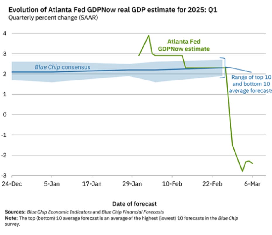 And yet, in this profusion of disappointing economic data, the most damning indicator is perhaps the one pointing to a likely economic recession. According to a high-frequency tracker of GDP growth (GDPNow) published by the Federal Reserve’s branch in Atlanta, the economy is projected to suffer a 2.8% contraction in the first quarter of 2025, an abrupt reversal from just a few weeks ago and a significant downward revision from its earlier estimate of -1.5% on February 28 and an initial positive forecast in January.